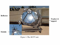A unique concept in solar energy, a miniature concentrating photovoltaic (MCPV) unit that captures and concentrates the sun’s light and heat to generate electricity. The genius of this concept is not so much in having invented something new as in having put together a variety of elements in a simple, streamlined system.