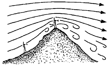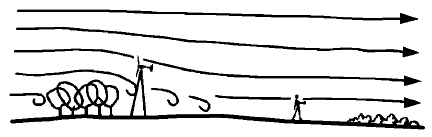 Choosing the Correct Tower HeightThe two most important considerations in planning the tower height for a wind turbine are avoidance of turbulent air flow produced near ground level by the 'roughness' of the terrain over which the wind flows, and avoidance of excessive ground drag which lowers wind velocity near the ground and severely restricts the performance of a wind turbine. TurbulenceA wind turbine must never be located such that it is subject to excessively turbulent air flow. Light turbulence will decrease performance since a turbine cannot react to rapid changes in wind direction, while heavy turbulence may reduce expected equipment life or result in wind turbine failure. You can detect turbulence by streaming a long ribbon from a guyed pole or mast to see if it streams easily in high winds from various directions. The mast should be roughly as high as you would envisage the wind tower to be. Turbulence may be avoided by