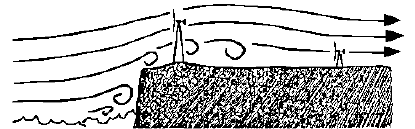![]() The grove of trees in this example will produce turbulence. A higher tower close to the trees places the wind generator above the turbulence. A shorter tower is safe if placed far enough away from the trees. ![]() Severe turbulence may be created by the sea cliff in this example. As above, a higher tower will be required near the cliff while a shorter tower will be safe if placed at a great enough distance from the cliff. ![]() Ground DragThe avoidance of ground drag will